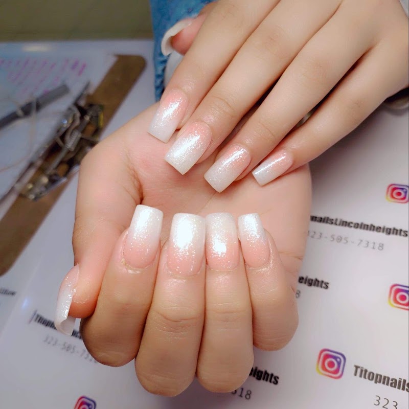 Titop Nails is a nail salon in Lincoln Heights, Los Angeles, rated 4.4 stars on Google. The salon is known for glitter-gel effects and intricate hand-painted nail art.