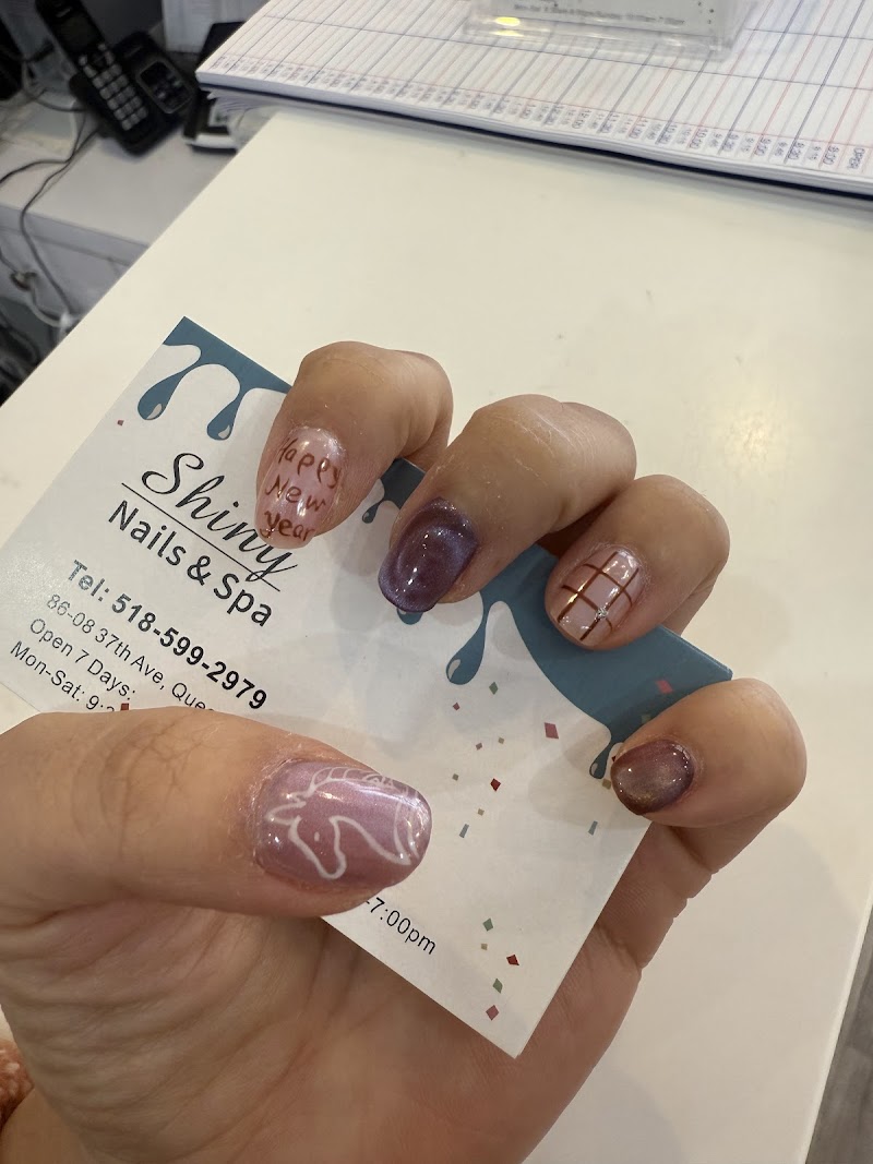 Shiny Nail&spa is a nail salon in Queens, New York, rated 4.2 stars on Google. The salon is known for high-shine glossy lacquers and intricate hand-painted nail art.